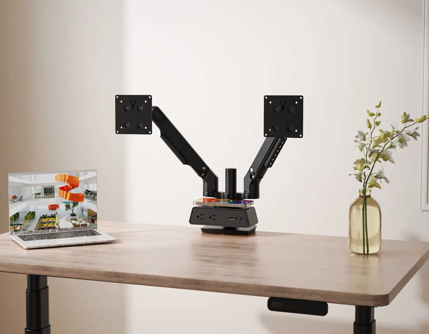 This dual-arm stand supports monitors from 14" to 32" and 2–9kg, offering full 360° rotation for optimal viewing angles. Height-adjustable up to 24cm, with tension control for smooth up/down positioning. Constructed from durable ABS and aluminum for a sturdy yet sleek design. Easily secured to your desk with a strong clamp connection. Built-in cable management and bottom wire routing keep your workspace clean and organized.